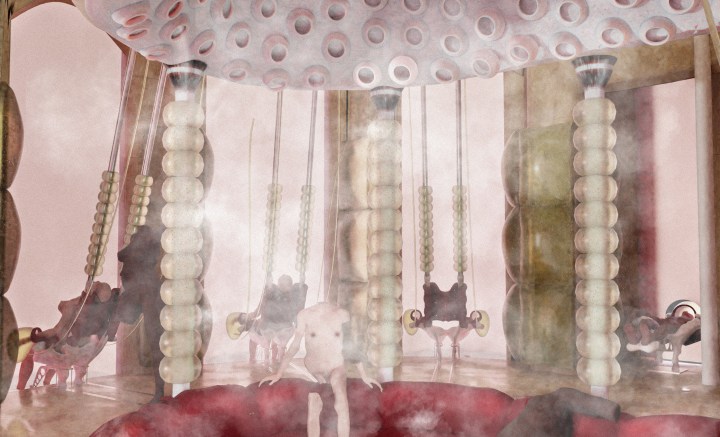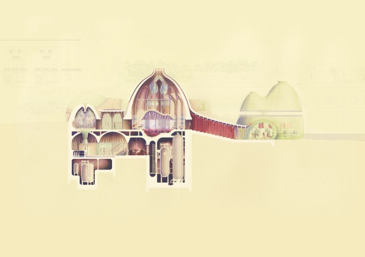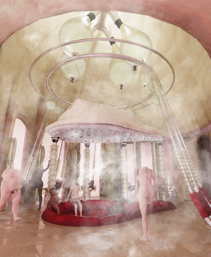 The architectural proposal, located on the boundary between the Brighton Nudist beach and the ‘normal’ beach, manifests in the form of a Nudist Changing Machine and Fetish Club, a facility in which the body can be dressed and undressed, bathed, celebrated, and flaunted.