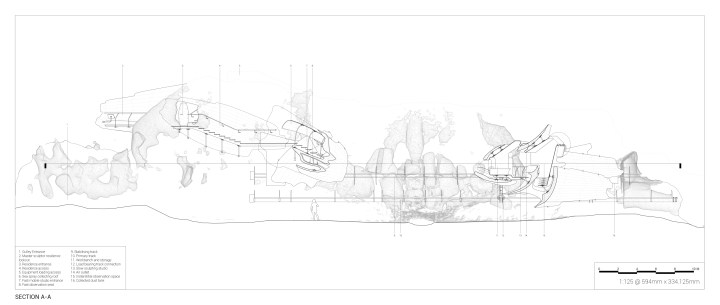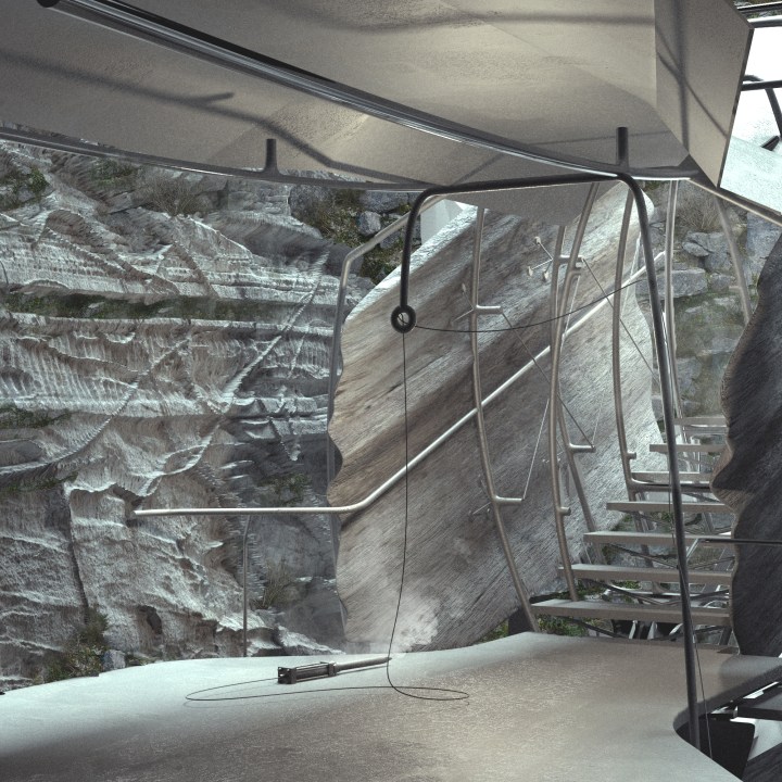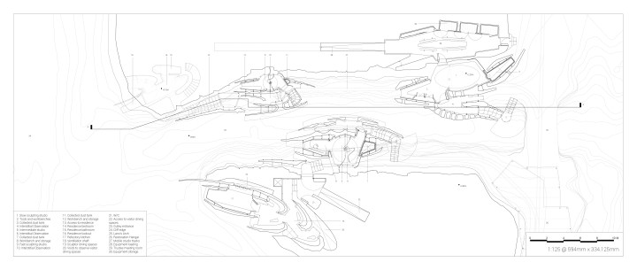 The studio component of each dependency is mobile, moving along a new network of rails that enables them to traverse the abandoned quarry, at their respective speed.