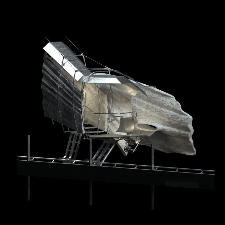 To support these durational acuities, the facility is partially constructed from un-noticed dust from the sculpting process. Forming like stalactites, the wind affects the shape of artificially created ‘geological’ shells, which reciprocally affects the wind as it passes through. Spaces inhabit these shells – turbulent wind flows prevents habituation, creating a slower experience of duration; whereas the consistency of laminar flow is utilised for faster durational experiences, and for ventilation.