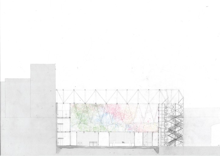 The architectural proposal is a community bar and performance space. The basement holds utilities; The lower ground, houses the main social space; and the ground floor, acts as an entrance and a visual anchor for the street above.