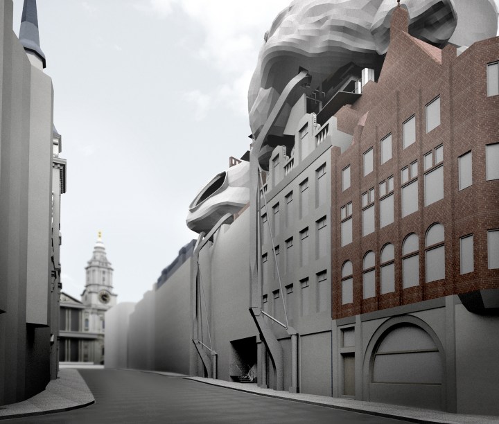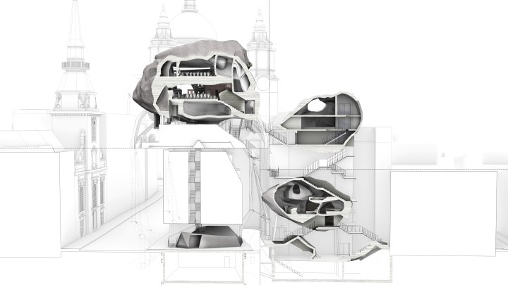 An investigation of merged realities resulting in the proposal of a theatre that invites motion and the use of parallax which was informed by a proof of concept model and research done in relation to my Thesis on spectacle from the Baroque to Film. The theatre is placed in the City of London which was historically rich in theatres, but is now completely devoid of them, to instigate renewed taste in theatre to the cold routine of the city. With a parasitic approach with minimal demolition, the design takes advantage of important landmarks around the City; St Paul’s Cathedral, Tate Modern and St Martin’s Church.