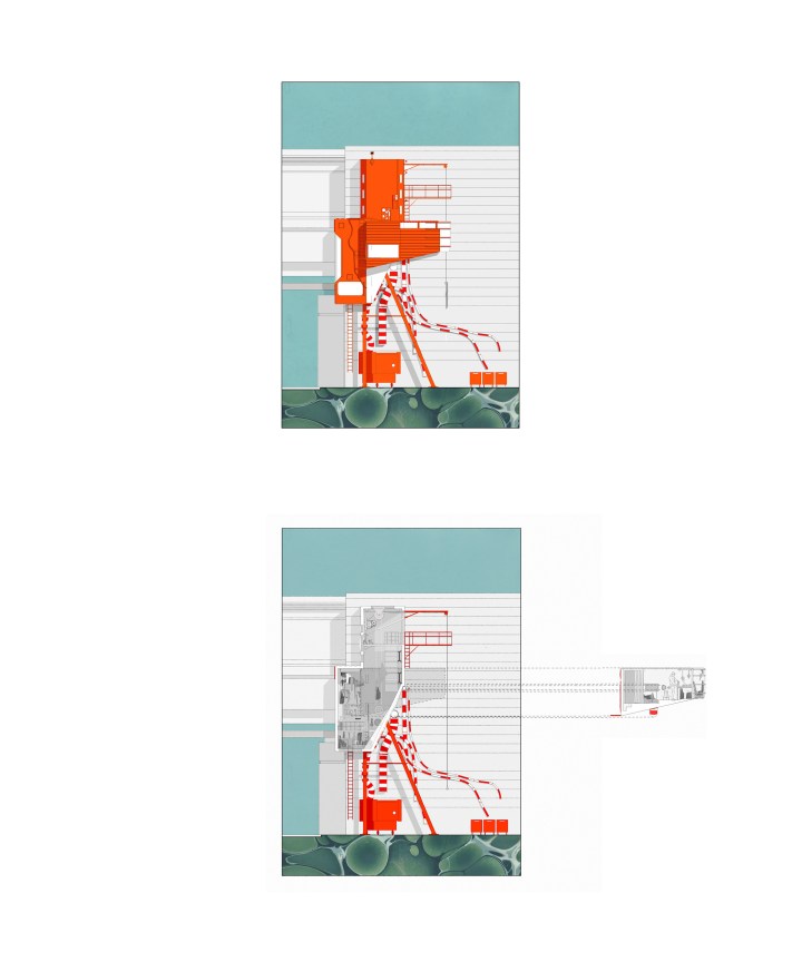 This building acts as a vertical processing tower: materials are lifted to the top, and move downward through stages of sorting, breakdown, and assessment for reuse. Pipes that reflect each material value and destination then excrete these parts.