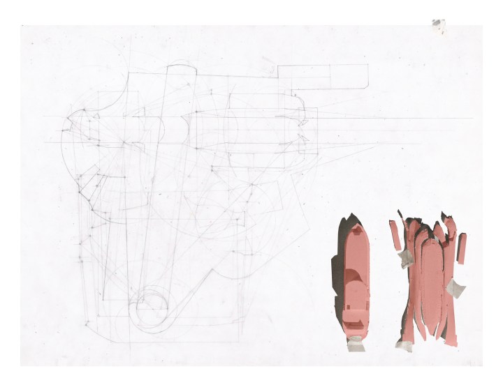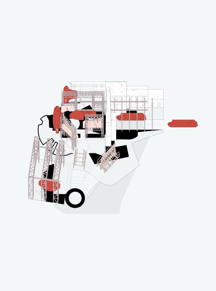 The project finds its narrative and form through the deconstruction and reorganising of boat hulls. Here, a key drawing in a series that iteratively reconstructs an unfolded river boat, beginning to speculate towards the buildings plan and functions.