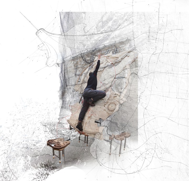 The climber’s embodied memory of rock faces – an understanding of space through movement, texture, and specific geometry – is used throughout the work. Furthermore, the climber’s body provides the project with a spatial language.