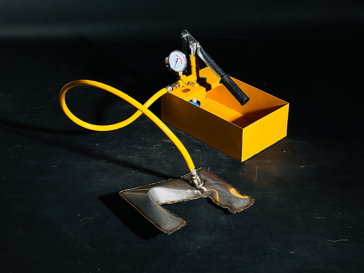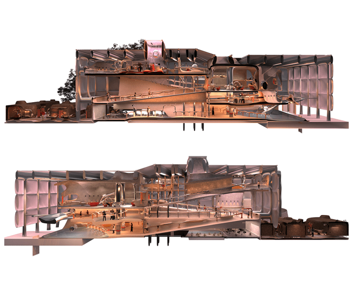 Hydroforming was tested on the building’s primary steel structure using a model. A water pump inflated a stainless steel envelope, simulating the desired structure.
