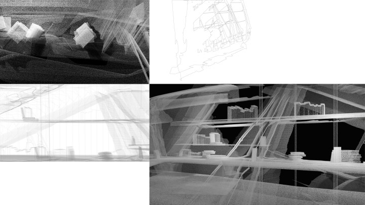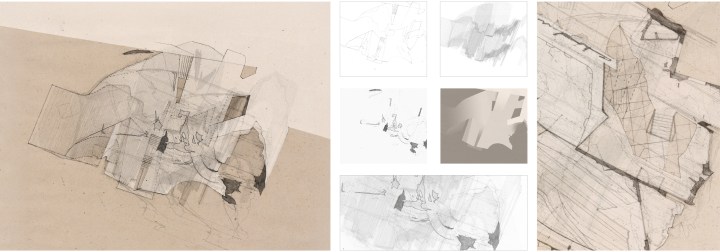 The renders capture shifting views of the building as one approaches, where the shipwreck image that shaped the form fragments and reconfigures. The form reveals new spaces and configurations, becoming an architectural image in motion.