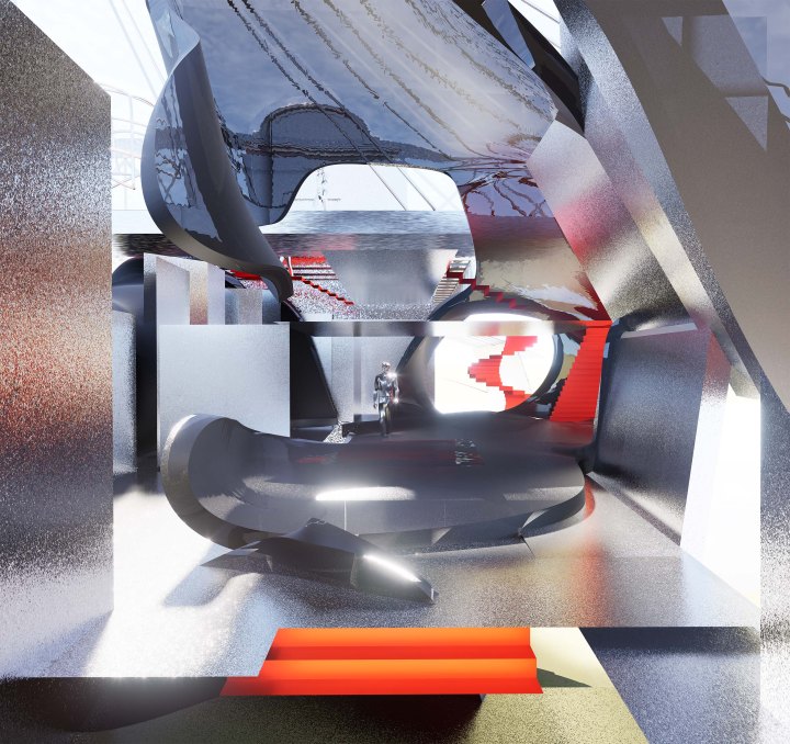 A visualisation of the building interior. Materials are chosen for their acoustic qualities, with walls and floors designed to resonate or soften sound. The space is tuned for listening through movement.