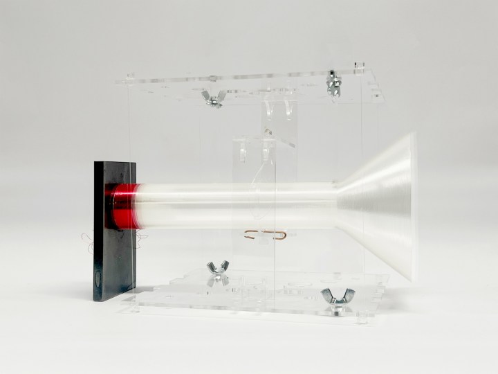 An electromechanical speaker prototype that amplifies low-frequency sound through a tensioned metal frame. The coil reacts to input pulses, causing the steel sheet to vibrate – demonstrating how structural form can act as both amplifier and resonator.