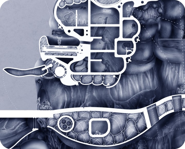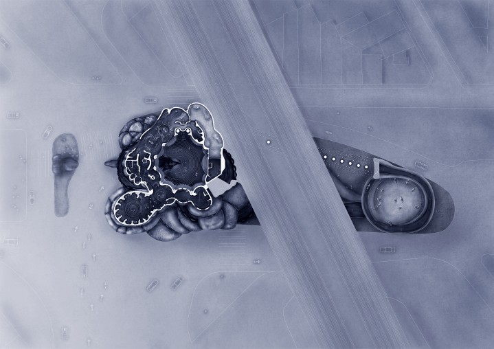 The project is located within a traffic intersection in Brussels and hosts the following: a motorcycle track that performs restraint on the building, a workshop for bike service, a biker social-club café and bar. Technical questions raised involve the rerouting of motorcycle traffic into and onto the building, and the possibility of creating the building’s own anatomical logic derived from 1:1 material findings.