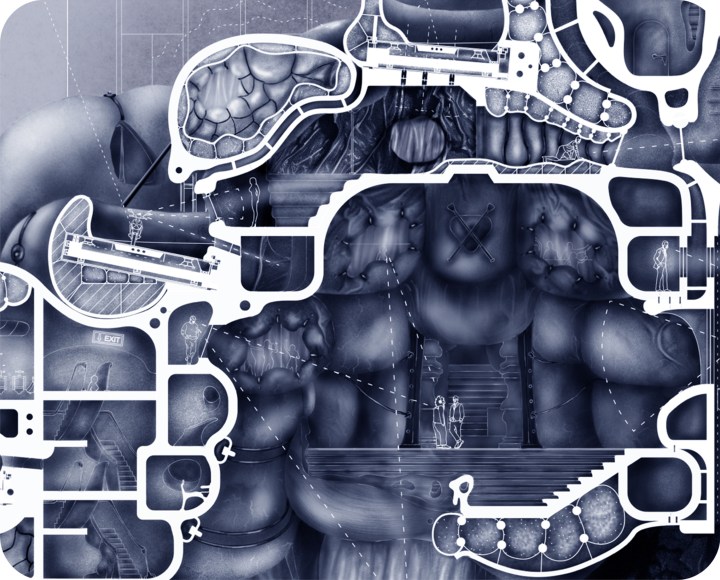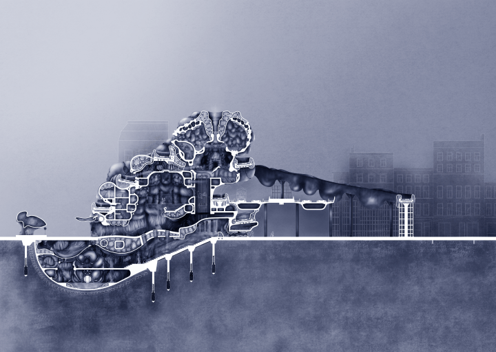 Bondage in Fifth Gear plays with the boundaries of tension; it explores the ways in which architecture can incarnate and enflesh drives and visceral experiences. It seeks new, unexpected tensions by exploring the idea that stimulation could come from an architecture of sensation. The project embraces otherness and provocation, and seeks to give architecture a surreal, sensory and anatomical life; where fat, muscle, sinew and bone are both structural and experiential. The proposal is a culmination of subcultural poetics drawn from a tectonic investigation of affect as a flirtation between speed, tension and proximity. The intertwined worlds of leather and motorcycle culture are embraced in an architecture that investigates the capabilities of a building to not only provide stimulation to its inhabitants, but also to itself – as a sensory being – by interacting with the bikes’ speed and force as they ride and bind it.