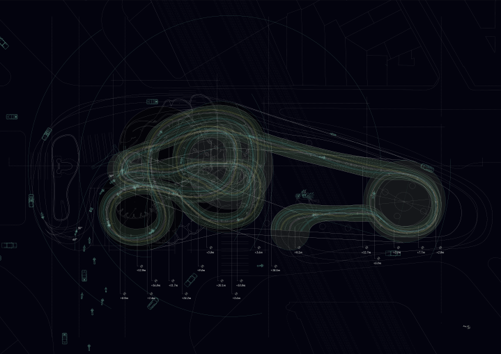 This map outlines the key information that comes into play when bikers ride the bondage track. The angles of entry into the building, the variance in the potential paths relative to (permitted) speeds and turning angles on the track, as well as the inclines and route that connects the track to the boulevard are highlighted.