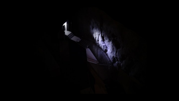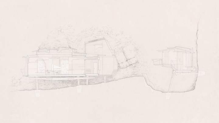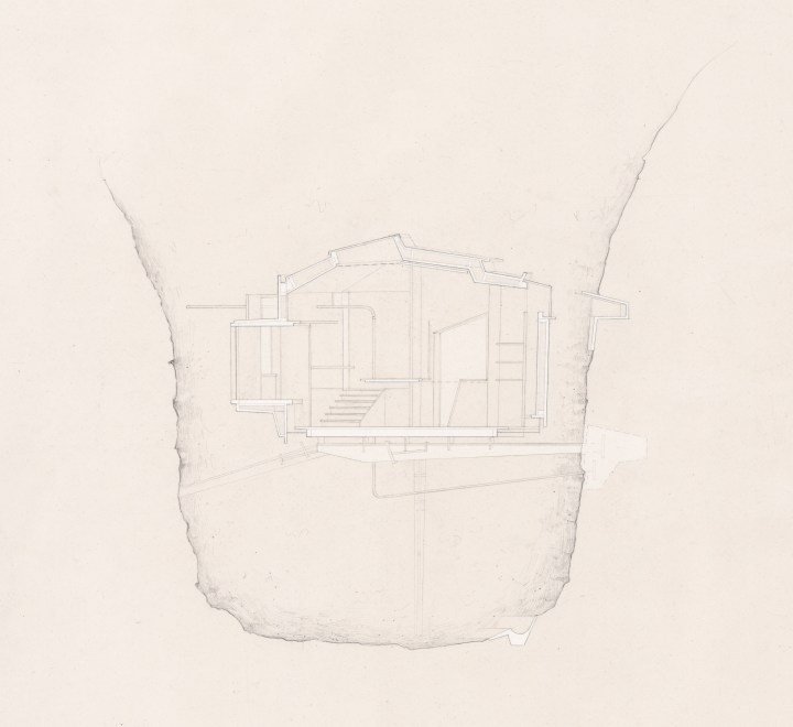 A stream of light ushered by the door opening of the Wedged Study announces its presence on the quarried rock face.