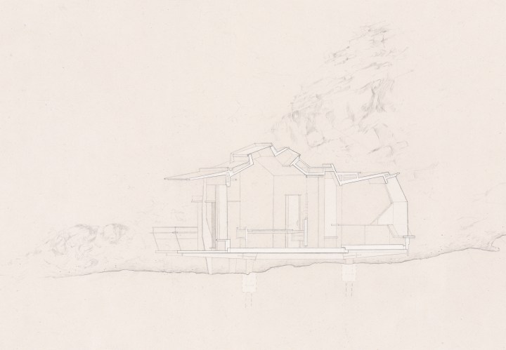 Two intersecting volumes, the interruption made palpable through architectural articulation. The entryway volume slides its geological floor plate and rood in between the dining’s, disrupting its lines and projecting surfaces in the landscape.