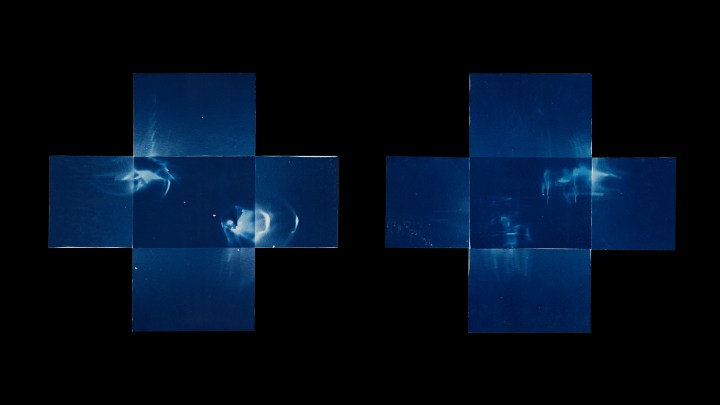 Skiastat device ghost impressions explore notions of presence. Cyanotype prints from Light Thieves, Shadow Bandits research.